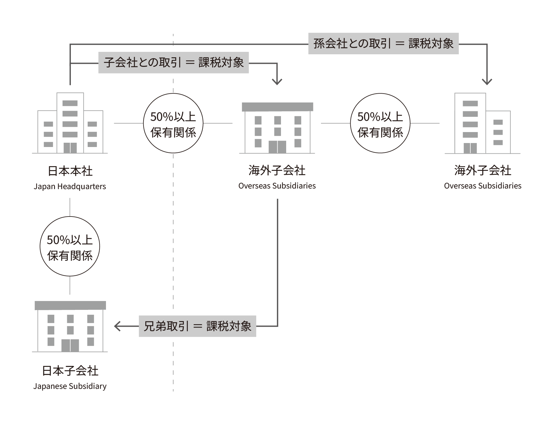 日本の税法では、50%以上の出資関係がある会社を「支配関係がある」とみなしています。また、この出資関係は直接だけでなく間接の持株関係も含まれるため、親会社・子会社だけでなく、兄弟会社や孫会社との取引も移転価格税制の対象になります。