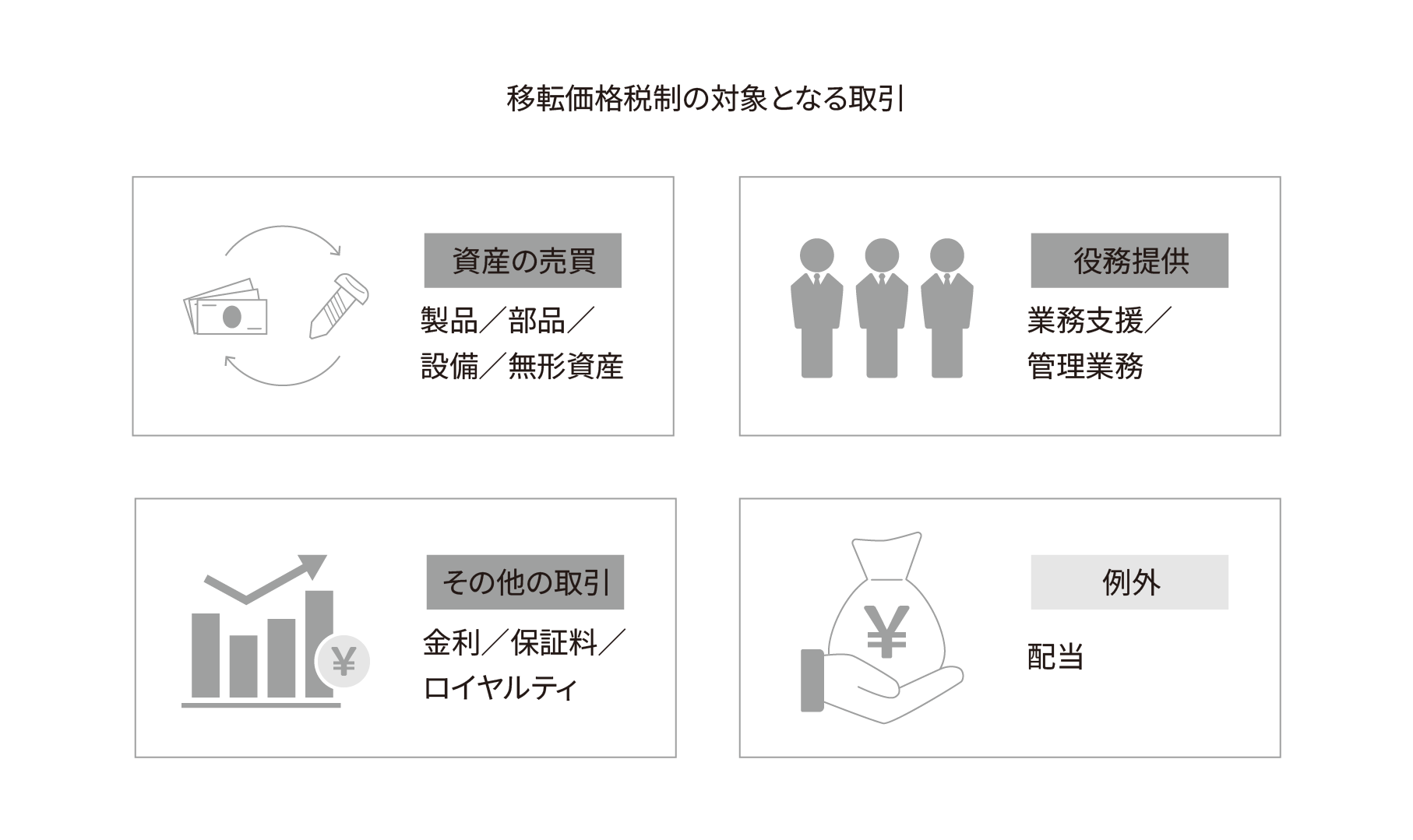 移転価格税制の対象となる取引は、出資や配当といった資本取引を除くグループ企業間で行われるあらゆる取引です。