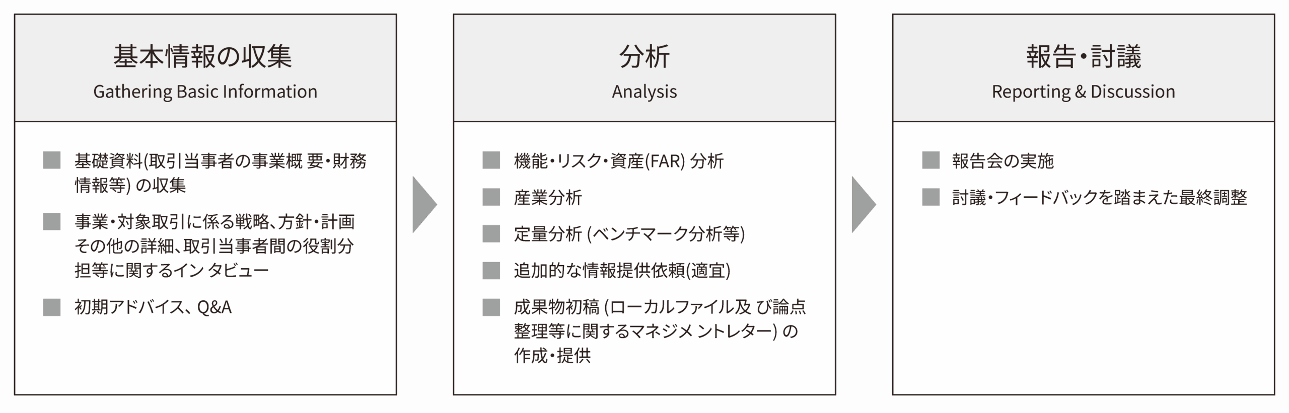 形式的なコンプライアンスに留めることなく、対応プロセスを通してその時点におけるリスクや課題にアプローチしながら、将来的な対応の検討までサポートしています。特に初めて移転価格対応に当たられる皆様にとってはインプットの機会にもなるように設計された標準的な対応プランになります。